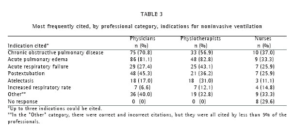 In our study, regarding the indications and contraindications of NIV, the number of correct responses given by physiotherapists was equal to that of those given by physicians and higher than that of those given by nurses. In addition, the physiotherapists demonstrated that their knowledge of the subject was more current than was that of the physicians or nurses.