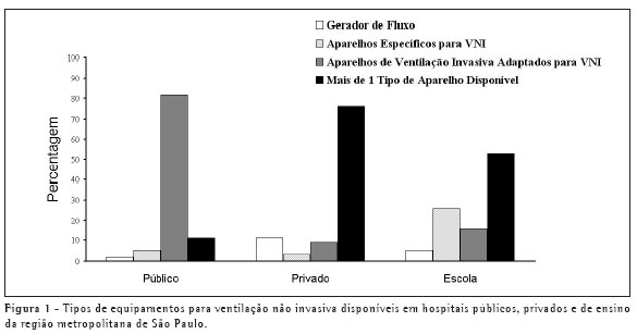 A disponibilidade para a realização de ventilação não invasiva é elevada nos hospitais da região metropolitana de São Paulo, independentemente da categoria hospitalar. Nos hospitais públicos predomina a VNI através da adaptação de aparelhos de ventilação invasiva. Nos privados predomina o gerador de fluxo e nos hospitais escola os ventiladores específicos para VNI.