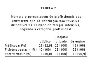 Optamos por quantificar a disponibilidade da VNI através de entrevistas, e não pela verificação no local, porque mais importante do que a UTI possuir equipamentos de VNI, é possuí-los e a equipe da UTI saber que estão disponíveis. Embora a questão 1 do questionário pudesse revelar uma situação de aparelhos disponíveis, mas sem que o procedimento da VNI estivesse disponível (por exemplo: falta de pessoas capazes de instalá-la) não acreditamos que ela seja comum. Outro problema que pode ter acontecido é o de profissionais terem respondido que havia equipamentos de VNI disponíveis quando de fato não havia. No entanto, pelo elevado grau de conhecimento e atualização, que mostraram médicos e fisioterapeutas, este problema nos parece improvável nestas categorias profissionais. Entre os enfermeiros, parece-nos que a situação contrária, em que há equipamentos disponíveis que não são conhecidos, é mais provável (Tabela 2).