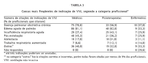 No nosso estudo, fisioterapeutas mostraram o mesmo grau de acertos nas indicações e contra-indicações de VNI que os médicos, e maior que os enfermeiros. Os fisioterapeutas também se mostraram mais atualizados e julgaram-se mais aptos a instalar a VNI do que médicos e enfermeiros. Com relação aos fisioterapeutas, a elevada percentagem de acertos na indicação e contra-indicação e a maior sensação de aptidão para instalar a VNI provavelmente se devem ao fato de que, na divisão de tarefas na UTI, cabe a esta categoria profissional a instalação e monitorização da VNI. Além disto, deve haver maior ênfase no ensino da VNI durante a graduação destes profissionais. Ao contrário, por não caber aos enfermeiros a tarefa de instalação e monitorização da VNI, esta categoria não se sente apta a instalá-la, mostrando-se pouco atualizada, com menor percentagem de acertos nas indicações e contra-indicações de VNI e maior percentagem de não resposta.
