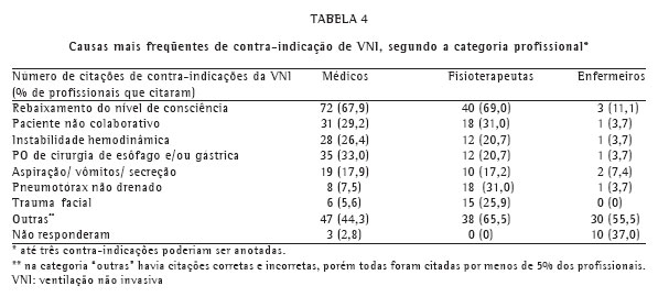 As questões 4 e 5, formuladas para avaliar o grau de conhecimento de cada classe profissional quanto às indicações e contra-indicações de VNI, estão representadas nas Tabelas 3 e 4. Um número