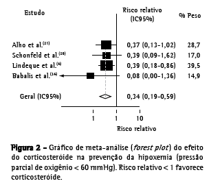 com o grupo controle. O risco relativo total de desenvolver hipoxemia foi 0,34 (IC95%: 0,19-0,59) no grupo que recebeu corticosteróide em