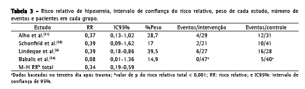 Na análise isolada do risco relativo de cada estudo, todos mostraram uma redução do risco de desenvolver SEG, mas em apenas dois estudos(21,22) a redução foi significativa (Figura 1 e Tabela 2). O risco relativo total de desenvolver SEG foi 0,16 (IC95%: 0,08-0,35) no grupo que recebeu corticosteróide em comparação com o grupo controle (valor p <0,001). O número que necessita ser tratado com corticosteróide para prevenir um caso de SEG foi 5. Não houve heterogeneidade significativa (valor p = 0,87). Na análise isolada do risco relativo de cada estudo, todos mostraram uma redução do risco de desenvolver hipoxemia, mas em apenas um estudo(4) a redução foi significativa (Figura 2 e Tabela 3). O risco relativo total de desenvolver hipoxemia foi 0,34 (IC95%: 0,19-0,59) no grupo do corticosteróide em comparação com o grupo controle (valor p <0,001). O número que necessita ser tratado com corticosteróide para prevenir um caso de hipoxemia foi 5. Não houve heterogeneidade significativa (valor p = 0,75).