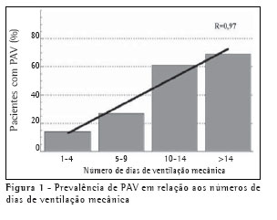 Neste estudo, 38,1% dos pacientes avaliados desenvolveram PAV, com taxa de 35,7 casos por 1.000 dias de ventilação. Têm sido encontradas taxas bastante variáveis, desde 20,5 a 34,4 casos por 1.000 dias de ventilação.(9-10,12) Estes resultados ultrapassam os dados do National Nosocomial Infections Surveillance System,(13) cuja taxa é de 13,5 casos por 1.000 dias de ventilação. Hoje não existe nenhum teste padrão ouro para o diagnóstico de PAV e nenhum método específico para a exclusão de infecção pulmonar em pacientes ventilados mecanicamente com febre e síndrome de disfunção orgânica múltipla. Isto pode ser a causa das taxas de PAV tão conflitantes entre unidades, hospitais, regiões e países.