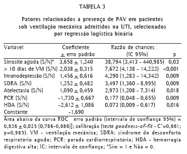 Na Tabela 3 são descritos os fatores relacionados à presença de PAV, selecionados por regressão logística binária. Observamos que sinusite aguda, atelectasia, SDRA, imunodepressão e período de mais de dez dias de VM foram as variáveis positivamente associadas à presença de PAV. Por outro lado, a presença de hemorragia digestiva alta e parada cardiorrespiratória foram variáveis protetoras, ou seja, nos pacientes que apresentaram essas características, a incidência de PAV foi menor. O modelo apresentou boa discriminação: área abaixo da curva receiver operating characteristics erro padrão (intervalo de confiança de 95%) = 0,836 + 0,025 (0,786 - 0,886); e boa calibração: teste goodness-of-fit - C^= 0,661; p = 0,985.