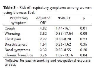 The results of our study show that 59.9% of the participants used BMFs, firewood accounting for 96% and dung accounting for only 1.1%. The high rate of BMF use is attributable to the fact that BMFs are the cheapest and most accessible sources of energy available to the rural women. In Nigeria, gas and electricity are not widely used because of their cost and, in the case of electricity, unreliability of supply, which has been a problem for more than a decade. We can assume that economic factors played the greatest role in our study sample, since the majority of the participating women had a low level of education (94.4%) and were of low socioeconomic status (93.8%). The role of socioeconomic status as a determinant of the type of cooking fuel used in the household has been described in other studies in developing countries.(14,15) According to one group of authors,(16) individuals tend to choose better and safer sources of energy as socioeconomic conditions improve. Our results also show that respiratory symptoms (cough, wheezing, chest pain, breathlessness, and nasal symptoms) and chronic bronchitis were more common in women using BMFs than in those using a non-BMF. This finding is similar to those of other studies.(16-20) The increased frequency of respiratory symptoms and chronic bronchitis can be attributed to toxic substances released during the combustion of BMFs. The inefficient burning of BMFs, in open fires or traditional stoves, generates large amounts of particulate matter, as well as CO, hydrocarbons, organic oxygen compounds, free radicals, and chlorinated organic compounds.(4)