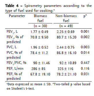 These toxic substances have been known to cause a decrease in mucociliary clearance and alveolar macrophage response, as well as suboptimal local immunity.(16) In addition, the acute inhalation of BMF smoke causes acute bronchial irritation, inflammation, and bronchial reactivity, whereas long-term exposure causes chronic airway inflammation, as well as increasing susceptibility to bacterial and viral lung infections.(16) The multivariate logistic regression analysis showed that women using BMFs were five times more likely to report cough and four times more likely to have chronic bronchitis, and these associations were statistically significant (p < 0.05). Our results support those of other studies.(9,10,18,20-22) Other respiratory symptoms have been associated with the use of BMF, although the risks were not significant. Among the 79 women who had reliable spirometry results, all of the measurements were lower in those using BMFs than in those using a non-BMF. These differences were significant for all of the spirometry parameters except the FEV1/FVC ratio and PEF. Our findings are similar to those of studies conducted in Ecuador and China, in which impaired pulmonary function in children was associated with exposure to indoor air pollution from BMF combustion.(23,24) The effects of BMF smoke on pulmonary function, as well as its association with obstructive and restrictive lung diseases, in adults have been well documented.(25-28) In animal models, exposure to toxic particulate matter has been associated with reduced lung compliance and decreased ventilatory response.(2,16) The use of BMFs for cooking has been described as a source of enjoyment for many women, and even a passion for some; unfortunately, it is a known health hazard.(29) We have attempted to determine whether the use of BMFs is associated with respiratory symptoms and chronic bronchitis. Our study was limited by our inability to measure indoor emissions, indoor concentrations, and personal exposure. Further studies should be carried out with more emphasis on those aspects, as well as on the levels of pollutants and the air exchange rate (ventilation).
