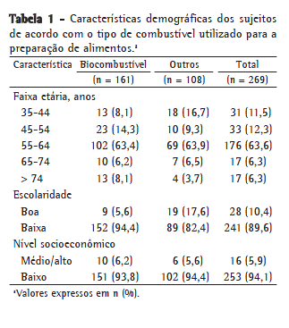 ResultadosDas 307 mulheres recrutadas para participar do estudo, 269 (87,6%) preenchiam os critérios de inclusão e foram incluídas. A média de idade das participantes foi de 55 ± 10 anos. Das 269 participantes, 241 (89,6%) tinham baixa escolaridade, e 253 (94,1%) foram classificadas como de baixo nível socioeconômico, o que foi atribuído à escolaridade e à ocupação. As características demográficas da população do estudo são apresentadas na Tabela 1. Com relação ao combustível utilizado para a preparação de alimentos, 156 (58,0%) das participantes utilizavam lenha, 3 (1,1%) utilizavam esterco/resíduos agrícolas, e 2 (0,7%) utilizavam carvão vegetal. Portanto, 161 mulheres (59,9%) utilizavam biocombustíveis, enquanto 108 (40,1%) utilizavam outro tipo de combustível (querosene). Nenhuma das mulheres utilizava eletricidade ou gás. Nossos resultados também mostraram que as mulheres que utilizavam biocombustíveis relataram sintomas respiratórios com mais frequência do que aquelas que não os utilizavam - tosse (13,7% vs. 3,7%), sibilância (8,7% vs. 2,8%), dor no peito (7,5% vs. 1,9%), falta de ar (11,8% vs. 6,5%) e sintomas nasais (9,3% vs. 4,6%; Tabela 2). Das 269 participantes, apenas 20 (7,4%) preenchiam a definição de caso de bronquite crônica. A análise multivariada por regressão logística mostrou que as mulheres que utilizavam biocombustíveis apresentaram maior probabilidade de relatar sintomas respiratórios e sintomas de bronquite crônica do que aquelas que não os utilizavam (Tabela 3). Um total de 99 mulheres se apresentou para a espirometria basal: os resultados foram confiáveis em 79 e ruins e não confiáveis em 20. Das que apresentaram resultados confiáveis, 30 utilizavam biocombustíveis para a preparação de alimentos e 49 não os utilizavam. Todas as medidas espirométricas foram menores entre as mulheres que utilizavam biocombustíveis do que entre aquelas que não os utilizavam, sendo essas diferenças estatisticamente significativas para todas as variáveis, exceto para PFE e relação VEF1/CVF (Tabela 4).