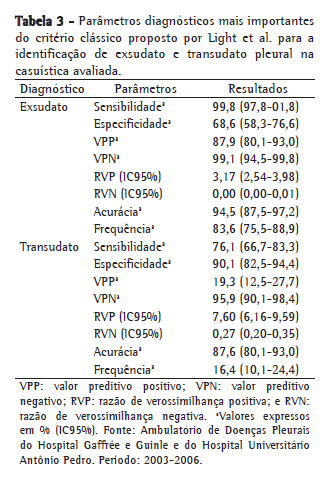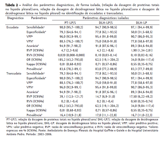 A Tabela 3 resume os parâmetros diagnósticos mais importantes do critério clássico pro­posto por Light et al. para a identificação de exsu­da­­to e transudato pleural na casuística avaliada. Nes­te caso, as dosagens de PTN e DLH foram utili­zadas como testes múltiplos em paralelo para o índice total de diagnóstico.