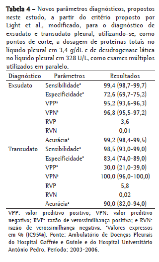 Após os exames múltiplos de PT-LP e DLH-LP serem utilizados em paralelo, os novos parâmetros diagnósticos propostos neste estudo, a partir do critério proposto por Light et al., modificado, para o diagnóstico de exsudato e transudato pleural, estão apresentados na Tabela 4.