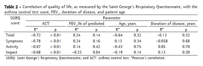 We used spirometric data, such as FEV1, which was measured before and after administration of a short-acting inhaled β2 agonist. Spirometry was performed in accordance with the Brazilian Thoracic Association guidelines.(15) To assess asthma control, we used the ACT, and to assess quality of life, we used the SGRQ.