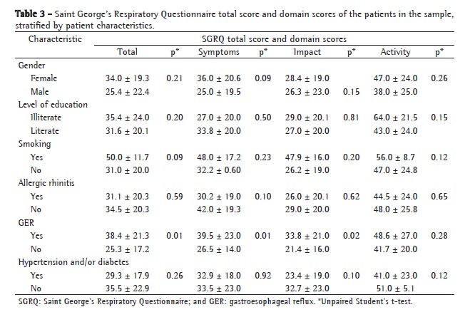 There were no significant differences in the SGRQ scores when patients were assessed for gender, level of education, smoking status, presence of allergic rhinitis, presence of systemic arterial hypertension, and presence of diabetes. When patients were assessed for presence of GER, there was a statistically significant difference in the SGRQ total score (p = 0.01), the SGRQ symptom score (p = 0.01), and the SGRQ impact score (p = 0.02; Table 3).