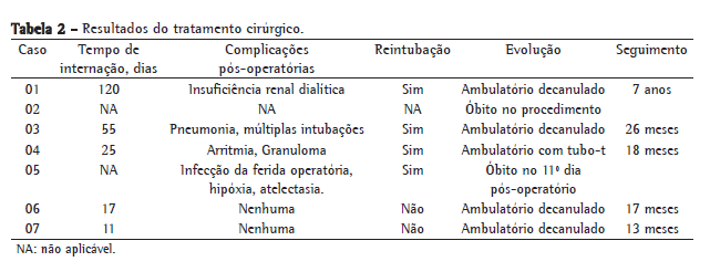 O tempo médio de internação foi de 45 dias, e a média de seguimento pós-operatório foi de 31,6 meses (variação, 13-84 meses), excluídos os óbitos intra-hospitalares. Nossa taxa de sobrevida após 30 dias foi de 71%. Ao término da coleta de dados, quatro pacientes estavam assintomáticos e absolutamente livres de doença, e um estava assintomático, mas ainda em uso de tubo T (Tabela 2).