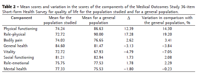 The SF-36 is composed of 36 items. There are 35 questions grouped in eight scales or components-physical functioning (10 items); role-physical (4 items); bodily pain (2 items); general health (5 items); vitality (4 items); social functioning (2 items); role-emotional (3 items) and mental health (5 items)-and an additional question comparing current health conditions with past-year health conditions (self-reported health transition). The SF-36 evaluates the negative aspects of health (disease or illness), as well as the positive aspects of health (well-being).(13,14)
