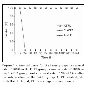 The animals in the survival group were divided into three subgroups: SL-CLP, L-CLP, and CTRL. After the animals in these three subgroups had been submitted to the above-mentioned procedure, they were housed in the animal facilities, with free access to food and water, for 144 h. The animals were observed every 12 h in order to determine the number of animals that remained alive.