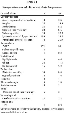 RESULTSOf the 493 patients undergoing lobectomies for lung cancer during the studied period, 305 met the inclusion criteria. Males predominated (68.5%), and the average age was 63.7 ± 9.7 years. There were 79 patients (26%) who were over 70 years of age. Of the patients studied, 90% of the patients had a history of smoking, with a mean consumption of 49.9 ± 27.7 pack-years. The mean body mass index (BMI) was 24.4 ± 4.4 kg/m2. A total of 27 patients (8.8%) received preoperative chemotherapy. Preoperative comorbidities were reported in 256 patients (83.9%) (Table 1).
