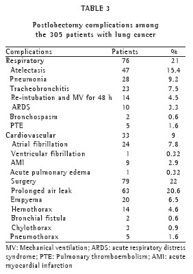 Postoperative complications in cases of lung cancer are related to various factors, including the type of resection performed. Some authors,(5) in their analysis of factors related to postoperative morbidity, found that resection of the thoracic wall or diaphragm and bronchial sleeve resection are factors that increase the rate of complications. The present study assessed the impact of postoperative comorbidities in a sample of lobectomies with resection of the pulmonary parenchyma exclusively.
