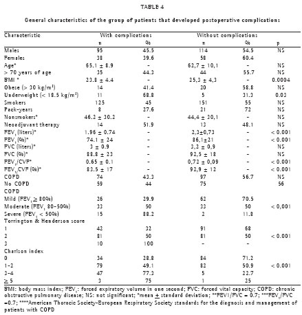 Mortality did not differ between the genders with respect to smoking, preoperative chemotherapy, COPD or BMI. Among the patients who were more elderly, the mortality was significantly higher (69.2 6.8 years vs. 63.5 9.7 years; p = 0.05). Despite this finding, mortality was not significantly higher among individuals over the age of 70 than among those younger than 70 (7.6% vs. 2.7%; p = 0.8). The FEV1 values were also lower among patients who died than among those who survived (67.3 ± 19 and 81.4 ± 23; p = 0.04). The absolute FEV1/FVC value was lower in the group of patients who died than in that of those who survived (0.59 ± 0.1 and 0.69 ± 0.12; p = 0.009). Higher Torrington & Henderson scores and Charlson indices were correlated with higher mortality. Mortality among patients with a Torrington & Henderson score of 3 was 20%, compared with 0.8% and 5.6%, respectively, among those with a score of 1 or 2 (p = 0.003). Among patients presenting a Charlson index of 3 or 4, the mortality was 13.6%. However, that value was not significantly different from that found for patients presenting a Charlson index of 1 or 2 (4.3% and 1.7%, respectively; p = 0.067).