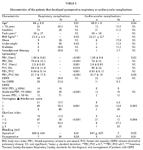 The univariate analysis revealed that gender and smoking habits presented no significant differences in terms of the incidence of postoperative complications. Being over 70 years of age also had no significant impact, since the mean age of those who presented complications was 65. Among those who presented complications (Table 4), the mean BMI was significantly lower. The absolute FEV1 values, FEV1 percentages and FEV1/FVC ratios were also lower in this group.