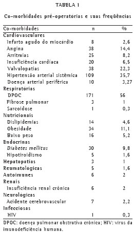 A DPOC foi considerada neste estudo como obstrução da via aérea não reversível ao teste com broncodilatador. Conforme os critérios da American Thoracic Society e European Respiratory Society,(9) os pacientes com a relação entre volume expiratório forçado no primeiro segundo e capacidade vital forçada (VEF1/CVF) = 0,7 foram considerados portadores de DPOC, utilizando-se o VEF1 (% do previsto) para estratificar-se a gravidade. Os tabagistas tiveram o consumo quantificado pelo número de anos/maço. As co-morbidades e sua freqüência estão descritas na Tabela 1. As escalas de risco aplicadas foram a de