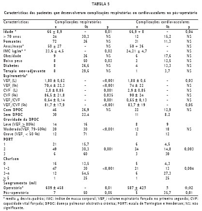 A análise univariada revelou que sexo e hábito tabágico não apresentaram diferenças significativas na incidência de complicações pós-operatórias. A idade superior a 70 anos também não apresentou impacto significativo, sendo 65 anos a idade média dos que apresentaram complicações. Dentre os que apresentaram complicações (Tabela 4), o IMC médio foi significativamente menor e os valores de VEF1 absoluto, percentual e a relação VEF1/CVF foram mais baixos.