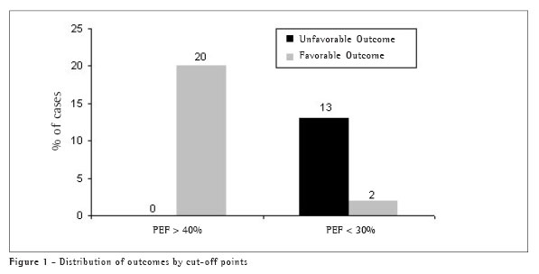 Considering the decision of the emergency room physician regarding whether to discharge or hospitalize the patient as a clinical outcome, we observed that: of the 20 patients with a PEF = 40% at 15 minutes, 18 were discharged from the emergency room, and 2 required hospitalization (a positive predictive value of 90% and a negative predictive value of 23%); of the 15 patients with a PEF < 30% at 15 minutes, 10 were discharged, and 5 were hospitalized (a positive predictive value of 66% and a negative predictive value of 11%).