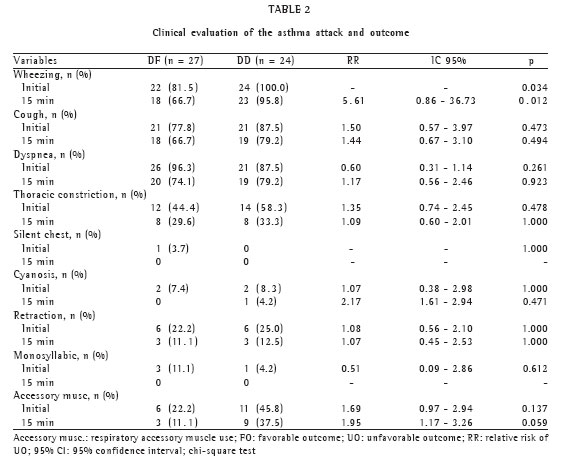 Table 2 presents the result of the clinical evaluation of the asthma attacks. When comparing the FO group with the UO group, a statistically significant difference was observed for the variables initial wheezing (p = 0.034) and wheezing at 15 minutes (p = 0.012).