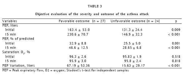 In this study, we did not evaluate the duration of asthma attacks prior to the arrival of the patient in the emergency room, the previous use of inhaled ß2-agonists at home or the regular use of inhaled corticosteroids between attacks. Nor did we classify the severity of asthma between attacks. Although this information might have been useful, we prioritized the simplification of the questionnaire so it could be applied in the emergency room.