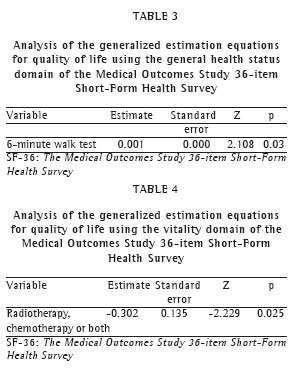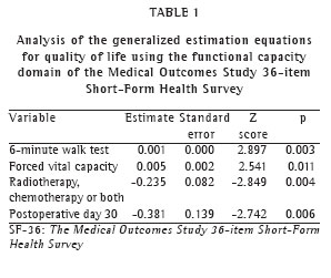 The results of the analysis using the generalized linear models and the GEE were adjusted for each domain of the SF-36 according to the independent variables of interest (gender, age, educational level, type of surgery, radiotherapy, chemotherapy, FVC and distance walked on the 6MWT).