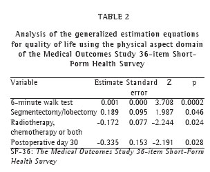 In a study involving twelve patients with chest cancer, no worsening of QoL or pulmonary function was found to result from the use of radiotherapy, chemotherapy or both.(25) With regard to pulmonary function, median FVC dropped from 98.5 ± 18.0% in the preoperative period to 81.5 ± 23.3% on postoperative day 180. When the statistical analysis was carried out using the GEE statistical model, FVC was found to be predictive of improved QoL in the functional capacity domain (p < 0.011). However, other authors have found that there was no correlation between the SF-36 results and pulmonary function.(21,26) In the 6MWT, the distance walked in the preoperative period was 509 ± 99.5 m, compared with 506 ± 95.1 m on postoperative day 180. When the GEE statistical model was used, we observed that the distance walked on the 6MWT was predictive of improved QoL in the following domains: functional capacity (p < 0.0003); physical aspects (p < 0.0002); and general health status (p < 0.03).
