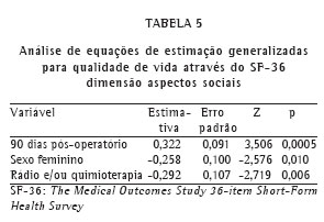 O sexo feminino, comparativamente ao masculino, demonstrou piora da qualidade de vida (p < 0,010). Também apresentaram piora os pacientes submetidos ao tratamento com radioterapia e/ou quimioterapia (p < 0,006) (Tabela 5).