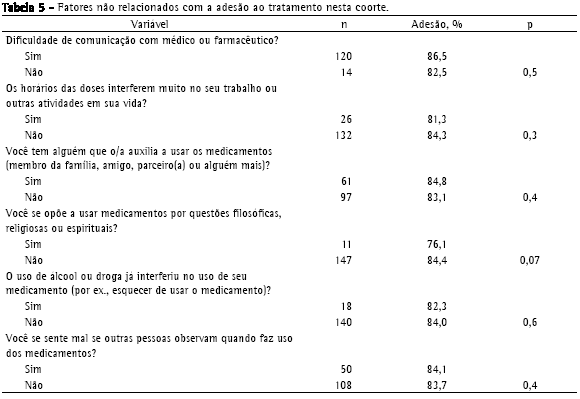 A Tabela 5 apresenta outras variáveis avaliadas neste estudo que não tiveram relação com a adesão ao tratamento.