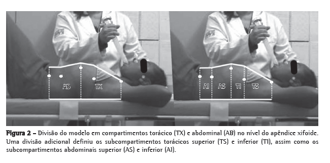 Após os testes iniciais, foram posicionados marcadores de superfície planos, esféricos, de 13 mm de diâmetro nos seguintes pontos: (1) espinhas ilíacas ântero-superiores; (2) nível da cicatriz umbilical, projetado lateralmente; (3) ângulo inferior da cartilagem da décima costela; (4) nível do apêndice xifoide, projetado lateralmente; e (5) nível da incisura jugular do manúbrio esternal, projetado lateralmente. Tais referências serviram de âncora para a delimitação geométrica de compartimentos toracoabdominais nas imagens adquiridas durante a realização das MIV. O traçado final resultou em adaptação para a postura deitada do modelo BAMER.(11)