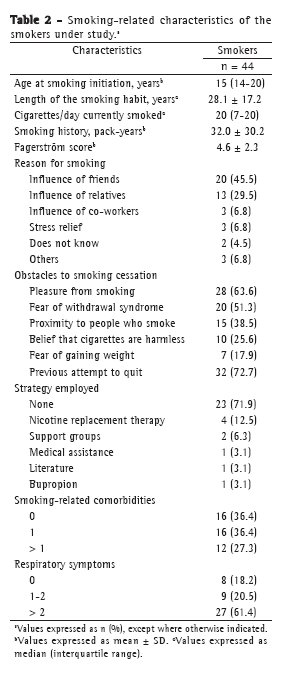 Among the 44 smokers under study, the mean age was 45.7 ± 15.2 years, with a predominance of male individuals (65.9%) and married individuals (52.3%). Of the 44 smokers, 23 (52.3%) were illiterate or had had less than 9 years of schooling. The median monthly family income was 2.5 times the national minimum wage (Table 1). Only 7 (15.9%) of the smokers performed physical activity regularly. In addition, 19 (43.2%) consumed alcoholic beverages regularly (Table 1).