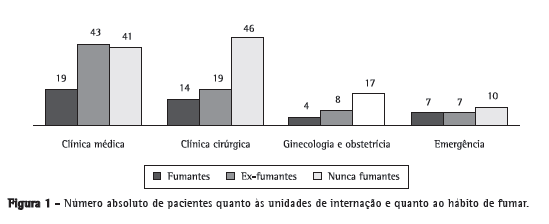 A Figura 1 mostra a distribuição dos pacientes internados nas diversas alas do hospital, divididos conforme seu status tabágico. Destaca-se a maior prevalência de tabagistas entre os pacientes da clínica médica.