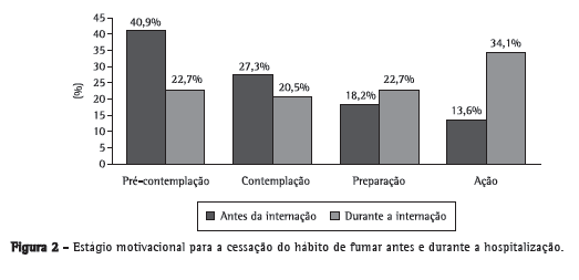 Quanto à motivação para a cessação do hábito de fumar, encontrou-se que, imediatamente antes da internação, o estágio motivacional mais encontrado foi o de pré-contemplação (40,9%). Durante a internação, predominou o estágio motivacional de ação (34,1%). Antes de serem internados, apenas 31,8% encontravam-se nos estágios de preparação ou ação, enquanto, durante a hospitalização, essa proporção passou para 56,8% (Figura 2).