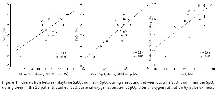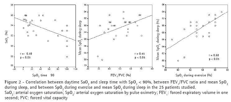 The present study demonstrated that, although SpO2 during sleep correlates with the FEV1/FVC ratio (%), daytime SaO2, daytime PaO2 and SpO2 during exercise, only daytime SaO2 was a predictor of nocturnal desaturation. This finding corroborates those of other authors.(6,21)