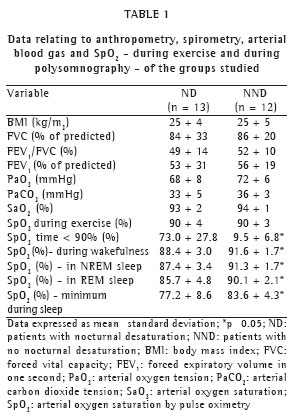Values of the studied variables are presented as means standard deviation. Student's t-test for independent samples was used in the comparative analysis between ND and NND group values. Pearson's correlation test was used to determine the level of correlation between the variables studied during daytime and those evaluated during sleep. (For this analysis, we considered the groups as a whole, regardless of the nocturnal desaturation.) Logistic regression was used to calculate the odds ratios and identify the independent variables that were predictive of nocturnal desaturation. In accordance with this mathematical model the following variables were tested: FVC, FEV1, FEV1/FVC, PaCO2, PaO2, SaO2 at rest and SpO2 during exercise. Values of p 0.05 were considered statistically significant.