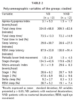 We observed that the ND group patients presented lower SpO2 values during REM and non-REM (NREM) sleep, as well as lower minimum SpO2 during sleep and a greater percentage of sleep time with SpO2 90%, than did the NND group patients (p < 0.05) (Table 1).