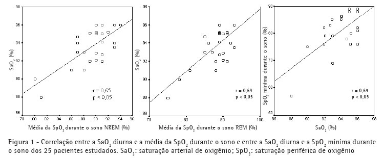 A literatura apresenta diferentes resultados sobre os parâmetros preditores da dessaturação noturna. Alguns autores verificaram correlação positiva entre SpO2 no sono e VEF1(21), SaO2 e PaO2 em vigília.(6,11) Além disto, foi observado que quanto maior a dessaturação noturna, menor a resposta ventilatória à hipercapnia e à hipoxemia.(12)