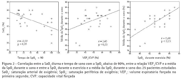 Na análise do grupo como um todo, houve correlação positiva e significativa entre a SaO2 e PaO2 diurnas com a SpO2 em vigília noturna, a média da SpO2 durante o sono e a mínima SpO2 durante o sono (Figura 1). Foi verificada, também, correlação negativa e significativa entre a SaO2 e a PaO2 diurnas com a porcentagem do tempo de sono com SpO2 abaixo de 90%, e correlação positiva e significativa entre a relação VEF1/CVF% e a SpO2 durante o sono. Além disto, houve correlação positiva e significativa entre a SpO2 no exercício e durante o sono (Figura 2).