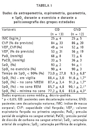 Dos 25 pacientes estudados, 13 apresentaram dessaturação noturna pela definição adotada (52%),(16) que esteve presente em 30% a 90% do tempo de sono. Estes resultados são muito próximos dos encontrados em outro estudo,(16) em que se verificou dessaturação noturna em 45% dos pacientes portadores de DPOC com hipoxemia leve. Os resultados deste trabalho refutam a afirmação de outros autores(6) de que valores diurnos de SaO2 iguais ou abaixo de 93% sempre ocasionam dessaturação noturna, pois no GND dois pacientes tinham SaO2 diurna de 91% e de 92%.
