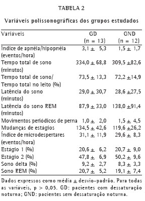 Os dados da polissonografia estão apresentados na Tabela 2, que mostra ausência de diferença estatisticamente significativa entre o padrão de sono dos dois grupos estudados.