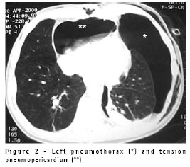 A 64-year-old male patient with chronic obstructive pulmonary disease was submitted for coronary artery bypass graft (CABG) with left internal mammary artery-left anterior descending anastomosis. In the intensive care unit, at two hours after extubation, he presented a spontaneous left-sided pneumothorax that was controlled through insertion of a 14FR pigtail catheter, after which the patient improved. Two days later, however, he presented respiratory discomfort and a second pneumothorax was seen despite the fact that the pigtail catheter remained in the pleural cavity and was unobstructed. A second pigtail catheter was inserted in an anterior position. The problem was resolved, and the catheters were removed. On the following day, the patient presented hypotension, tachycardia and dyspnea. For technical reasons, it was not possible to perform an echocardiogram. A CT scan showed an anterior left pneumothorax and a large pneumopericardium (Figure 2). A 32FR chest tube was inserted into the left pleural cavity, and the problem was completely resolved. The patient also underwent talc pleurodesis. The same simple solution (tube thoracostomy) was applied in this second case.