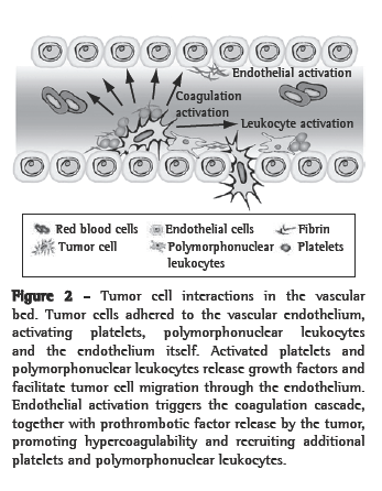 Platelets are particularly affected by cancer: up to 30% of patients present increases in platelet count, whereas 11% present decreases.(10) It has been demonstrated that in vitro platelets aggregate in the presence of cancer cells and there is ­thrombocytopenia when cancer cells are infused in vivo.(11) Platelet activation can be mediated by direct cell-to-cell contact and by the release of several factors, such as adenosine diphosphate, thrombin, other proteases and interleukins. Activated platelets have greater adhesive capacity and interact with other cells, such as leukocytes, endothelial cells and tumor cells.(12). Tumor emboli are usually enfolded within a fibrin-platelet net that contributes to endothelial adhesion. This tumor thrombus, adhered to the endothelium, causes a lesion, and consequently, there is the release of vascular permeability factor, as well as the local loss of inhibition of platelet aggregation, anticoagulation and vasodilation.(6)