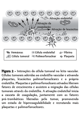 As células tumorais ligadas ao endotélio geram ativação da coagulação local com formação de trombo, adesão e ativação de plaquetas e leucócitos (por meio de citocinas liberadas), conseguindo atravessar a parede dos vasos. A formação do trombo permite todo esse processo e os leucócitos ajudam na invasão da parede vascular (Figura 2).(7)