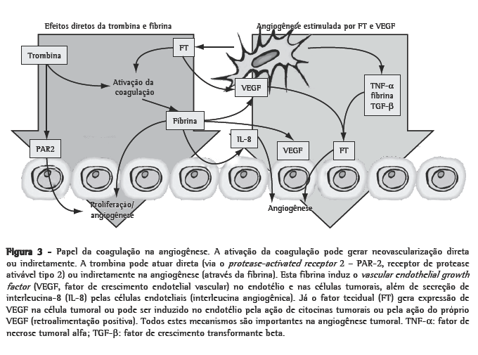 A ativação da cascata da coagulação culmina na geração de trombina e conseqüente formação de fibrina. Estas duas substâncias têm efeitos que auxiliam no crescimento e disseminação neoplásicos.(7) A fibrina especialmente tem capacidade para modular a expressão do VEGF nas células neoplásicas e também no endotélio normal. Esse efeito é particularmente importante para a formação de novos vasos sangüíneos (Figura 3).(13)