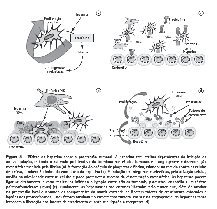 As heparinas formam um grupo especial desta classe por terem propriedades específicas antitumorais. Primeiramente, as heparinas impedem a ligação das células malignas com plaquetas, leucócitos e endotélio, já que se ligam a moléculas de adesão, como a P-selectina ou integrinas. Estas drogas também inibem uma enzima tumoral chamada heparanase, que facilita a penetração maligna na membrana basal vascular, pois quebra a barreira polissacáride. A heparanase também facilita a liberação de fatores de crescimento vascular no microambiente tumoral que estão ligados ao heparan-sulfato na matriz extracelular. As heparinas ainda podem ligar-se diretamente aos receptores endoteliais e interferir na ação de fatores de crescimento. Finalmente, elas exercem ação reguladora no sistema imune, modulando a ação de diversas citocinas envolvidas na migração de leucócitos e na destruição de câncer (Figura 4).(7) As HBPM ligam-se de forma mais intensa a alguns receptores de fatores de crescimento do que as HNF,(26) assim como inibem outros, como o VEGF e o fator de crescimento fibroblástico tipo beta.(27) Por estas vantagens, além de apresentarem melhores propriedades farmacocinéticas e menor toxicidade frente às HNF, as HBPM são atualmente preferidas em estudos clínicos.(5)