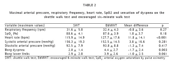 Baseline values on both tests were similar for the following variables: sensation of dyspnea and lower limb fatigue (Borg), systolic arterial pressure, diastolic arterial pressure, HR, SpO2 and respiratory frequency (data not shown). After the E6MWT, patients presented higher HR and sensation of dyspnea than after the SWT (p < 0.001 and p = 0.003, respectively, for the two variables). There were no statistically significant post-test differences in any of the other parameters (Table 2).