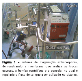A utilização mais amiúde da ECMO para tratamento de pacientes com hipoxemia refratária por influenza A (H1N1) fez ressurgir o interesse nessa modalidade de suporte. A ECMO é usada em centros especializados neonatais, pediátricos e de adultos para insuficiência respiratória e cardíaca. Trata-se de um dispositivo capaz de dar suporte às trocas gasosas, o que permite o "descanso" pulmonar até a recuperação do processo patológico e diminui os potenciais efeitos deletérios da lesão pulmonar induzida por ventilação mecânica. Dessa forma, a ECMO pode ser considerada a terapia de resgate definitiva para pacientes com hipoxemia refratária, já que, durante a utilização do sistema, a troca gasosa pulmonar pode chegar a ser desnecessária. A técnica consiste em remover o sangue utilizando uma bomba (centrífuga ou peristáltica) e impulsioná-lo através de um pulmão artificial (Figura 1). Para tanto, a técnica mais utilizada é a veno-venosa, na qual o sangue venoso é retirado, oxigenado e devolvido ao próprio sistema venoso do paciente, oferecendo-lhe, assim, suporte respiratório.(6) Também podem ser utilizados acessos veno-arteriais, nos quais o sangue é retirado da circulação venosa e devolvido à aorta, propiciando suporte cardiopulmonar (débito cardíaco e trocas gasosas).